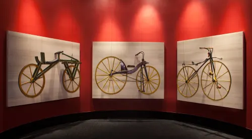 Rarely displayed artifacts include an 1890 "safety bicycle" that revolutionized the industry, replicas of the 1818 Draisienne Walking Machine and an 1830 McMillan, one of the first pedal bikes. The 1960s Sears Spaceliner is a chrome-edged mirror of its era, just as new cardboard and hardwood designs reflect concerns about resources and craftsmanship. Explore trends and technologies used by elite athletes, urban riders and bike enthusiasts.
