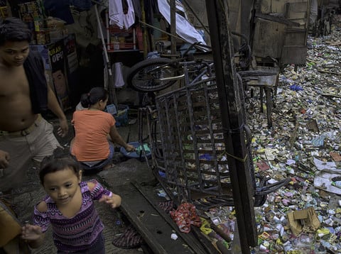 Montones de basura contaminan el arroyo Estero de Binondo, en el área del barrio chino de Manila. Desde allí, el plástico fluye hacia el río Pásig y hacia la bahía de Manila. Según los informes, el río representa el 6.4 % de todos los plásticos que contaminan el océano.