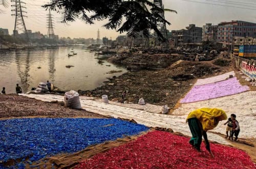 Virutas de plástico de color, recogidas, lavadas y clasificadas a mano, se secan en las orillas del río para su reciclaje. Una enorme sobrecarga de plástico en Bangladés se desecha y termina en el río, que lo lleva hacia la bahía de Bengala.