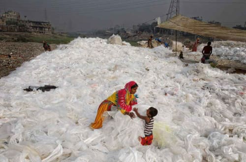 Una madre y un niño trabajan juntos clasificando plástico en Daca, donde el reciclaje de residuos plásticos se ha convertido en una industria informal. Aquí, la madre le enseña a su hijo cómo empacar los residuos plásticos después de haberlos lavado en el río Buriganga.