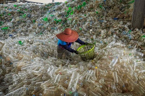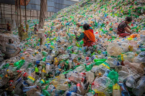 Cada minuto se usan más de un millón de botellas de plástico. En un centro de reciclaje de Daca, los trabajadores clasifican una enorme pila de botellas de plástico desechadas. Más de 646 toneladas de residuos plásticos se recogen a diario en la ciudad capital, lo que equivale al 10 % de todos los residuos recogidos en Bangladés.