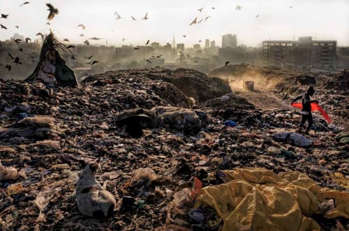 Los recolectores de residuos empiezan su día buscando plástico en el vertedero. Un perro observa cómo las aves vuelan sobre esta ciudad de basura, que se encuentra en el distrito de Thane, en las afueras de Bombay. La mayoría de los recolectores de residuos recogen plástico para el reciclaje.