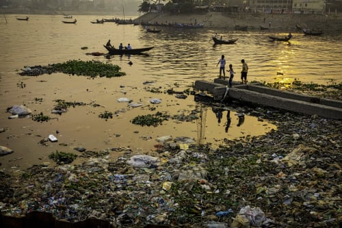 ¿Qué efecto tiene la contaminación por plástico en el sector turístico? La basura de plástico contamina las orillas del río Buriganga mientras los capitanes de botes navegan por las aguas negras. El río, que alguna vez fue un importante curso de agua que pasaba por las afueras de Daca, es ahora uno de los más contaminados de Bangladés.