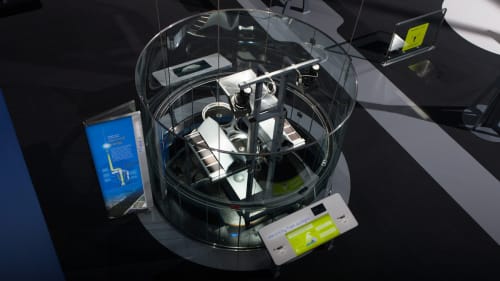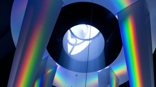 Recreate Newton’s famous prism experiment on a large scale. Rotate a mirror to redirect natural light from the Museum's rooftop heliostat mirror into one of four giant optical prisms. Just as Newton demonstrated, the prism splits white light into its component wavelengths. The result? A huge rainbow, brilliantly reflected on 30-foot-tall white screens.