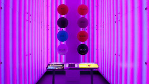 What you perceive as an object's color is actually a section of the light's wavelength being reflected by the object. Remove that wavelength from the light, and you'll no longer "see" the object's color. Sounds crazy? Step into the "color room" and see for yourself. Adjust the amount of red, blue or green in the room's light. What happens to the circle marked "BLUE" when you take out the blue light? You may not believe your eyes.