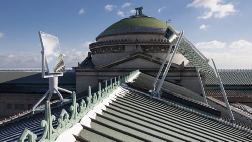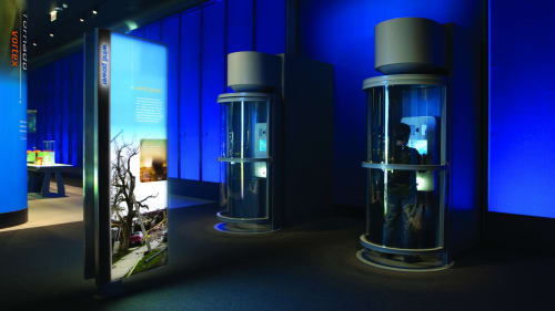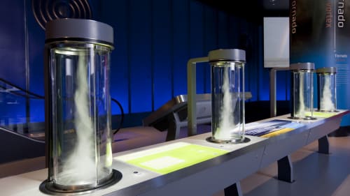 Prepare to be blown away by this 40-foot tornado — a vortex of swirling, illuminated vapor rising continuously from the floor. Manipulate and measure the dynamics of this vortex from both levels of the exhibit. Surrounding the base of the vortex are control panels for shaping the air column with a series of dampers. Produced under a license granted by Ned Kahn.