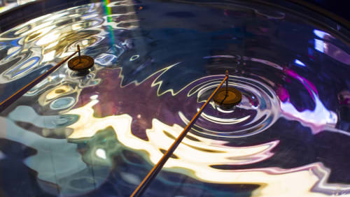 See in vivid detail how waves interact with objects and other waves. With the turn of a dial, trigger a "tapper" that creates controlled and beautiful patterns on the surface of three large ripple tanks. Suspended from the ceiling, the tanks are illuminated from above to cast huge rippling shadows on the floor below. Each tank is designed to display a different wave phenomenon: diffraction, interference, or reflection and diffusion.