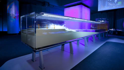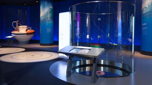 A wave is energy being moved from place to place through a medium such as air or water. Discover the power and motion of waves and their fundamental properties. You can design your own wave by choosing variables like wavelength and amplitude, and then launch it down the length of a 30-foot wave tank. Generate waves in round ripple tanks to watch them interact with objects or other waves. Stand below a 20-foot-tall rope that oscillates as you vary the amplitude and frequency to produce a striking, interactive light sculpture, revealing the art within waves.