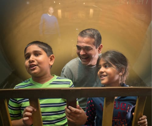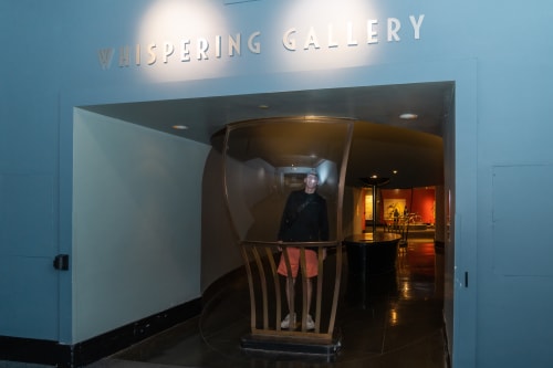 A Museum favorite since 1938, the Whispering Gallery still sounds as good as it looks. You and a friend stand with your backs to each other at either end of this long room. When you whisper into the curved dish in front of you, your friend across the room hears you as though you are just inches away. No wires, no power. Can you figure out how it works?
